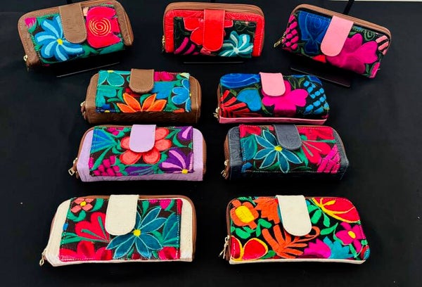These beautifully crafted artisan wallets are made from premium embossed leather and come in a vibrant palette of colors. Each wallet showcases traditional Mexican craftsmanship, blending timeless techniques with modern style. These wallets feature elegant embossed leather paired with colorful embroidered panels of blue, green, and yellow florals, offering a pop of personality. Compact yet stylish, these wallets are perfect for keeping your essentials organized in a unique, eye catching design. Available in 3 sizes and over 7 different unique designs.